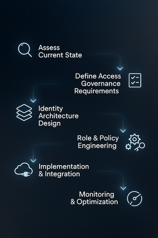 We take a structured, phased approach to modernizing and securing your IAM environment. Our consultants work alongside your technical and governance teams to ensure every step delivers measurable outcomes.