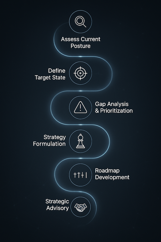 We work collaboratively with your leadership and technical teams to define a strategic plan that is realistic, scalable, and aligned with your business and operational environment. Our approach balances technical depth with practical execution, ensuring that every phase leads toward measurable improvement and risk reduction.